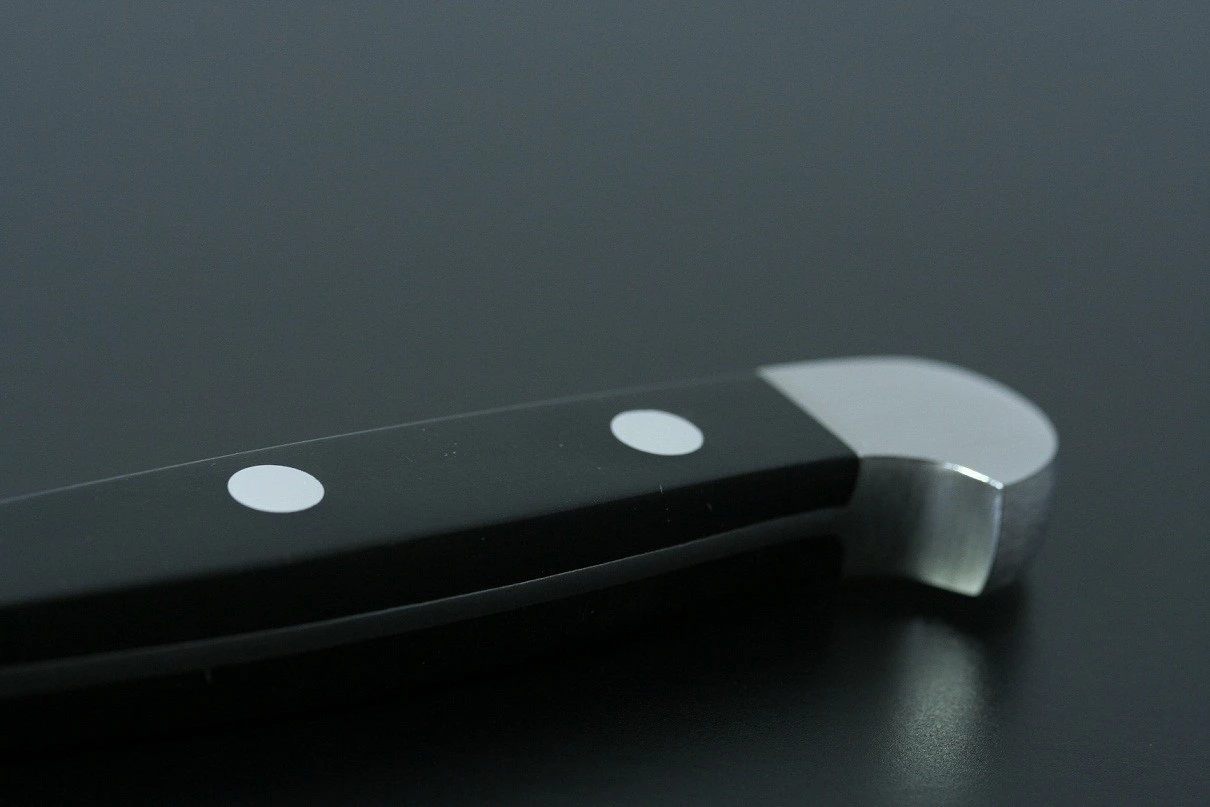 Slightly polished, the handle is made of POM, and it is secured with three steel rivets that are fixed to the full tang. As the inner steel structure of the handle is the same piece of steel of the blade, both parts are perfectly balanced.