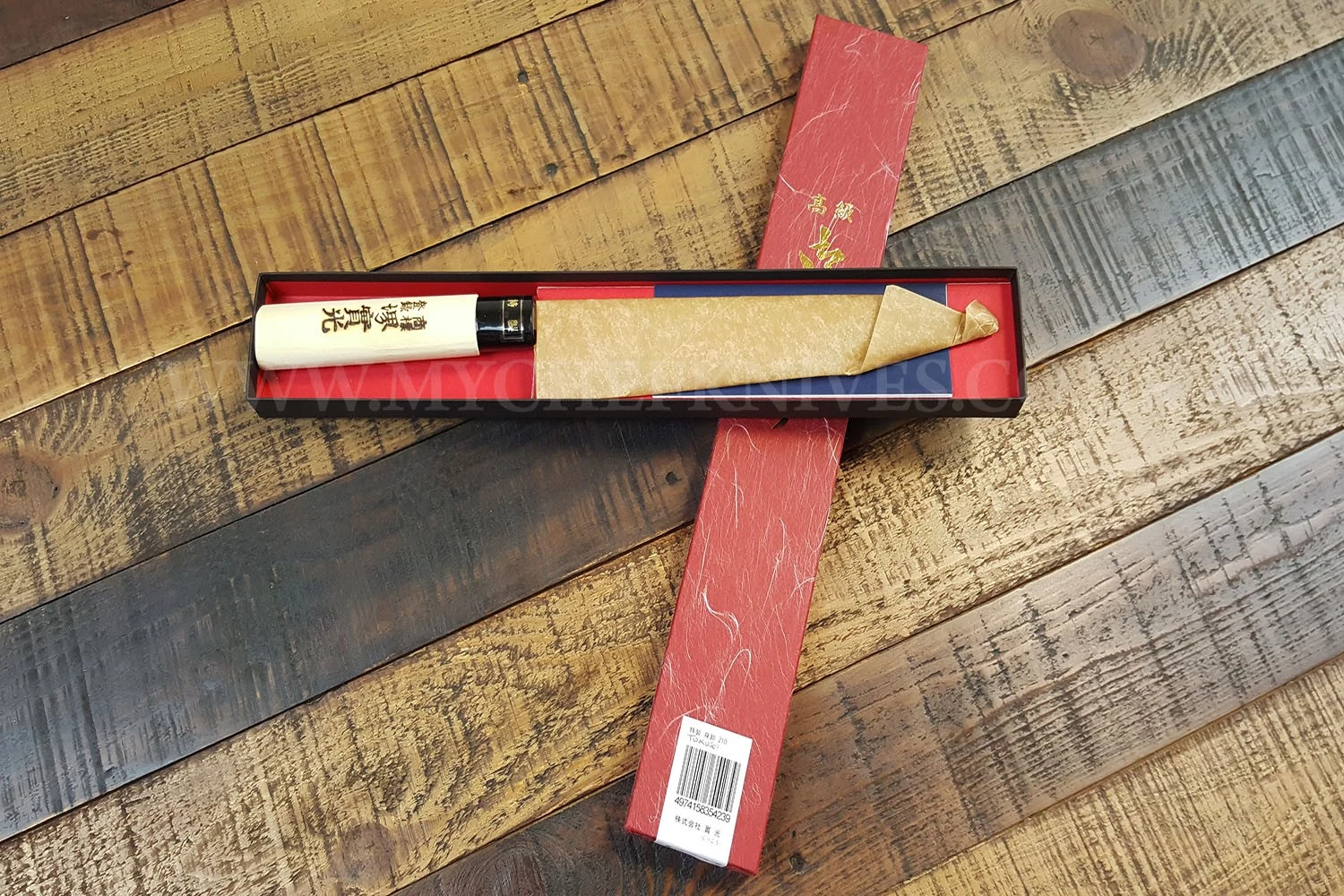 As it is the case for every knife from the Jikko Tokusei series, the blade was sharpened by hand by an artisan with a lifetime experience in the sharpening of blades. The sharpening process involves the use of different sharpening stones of different grains. The artisan starts by using a thick, coarse grain, and finishes by using a stone with fine grains 3000. The smooth transition from coarse to fine grains allows the blade to have an excellent sharp finish.