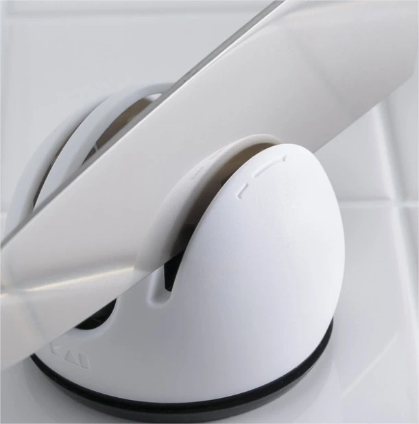 Small but powerful, the Kai Q sharpener is made of white and black polymer. Its base has a suction cup system powered by a small black lever on the top of the device. Once activated, this feature gives the sharpener complete stability by fixing it against the surface where it lies. This allows you to sharpen your knives easier, safer, and faster.