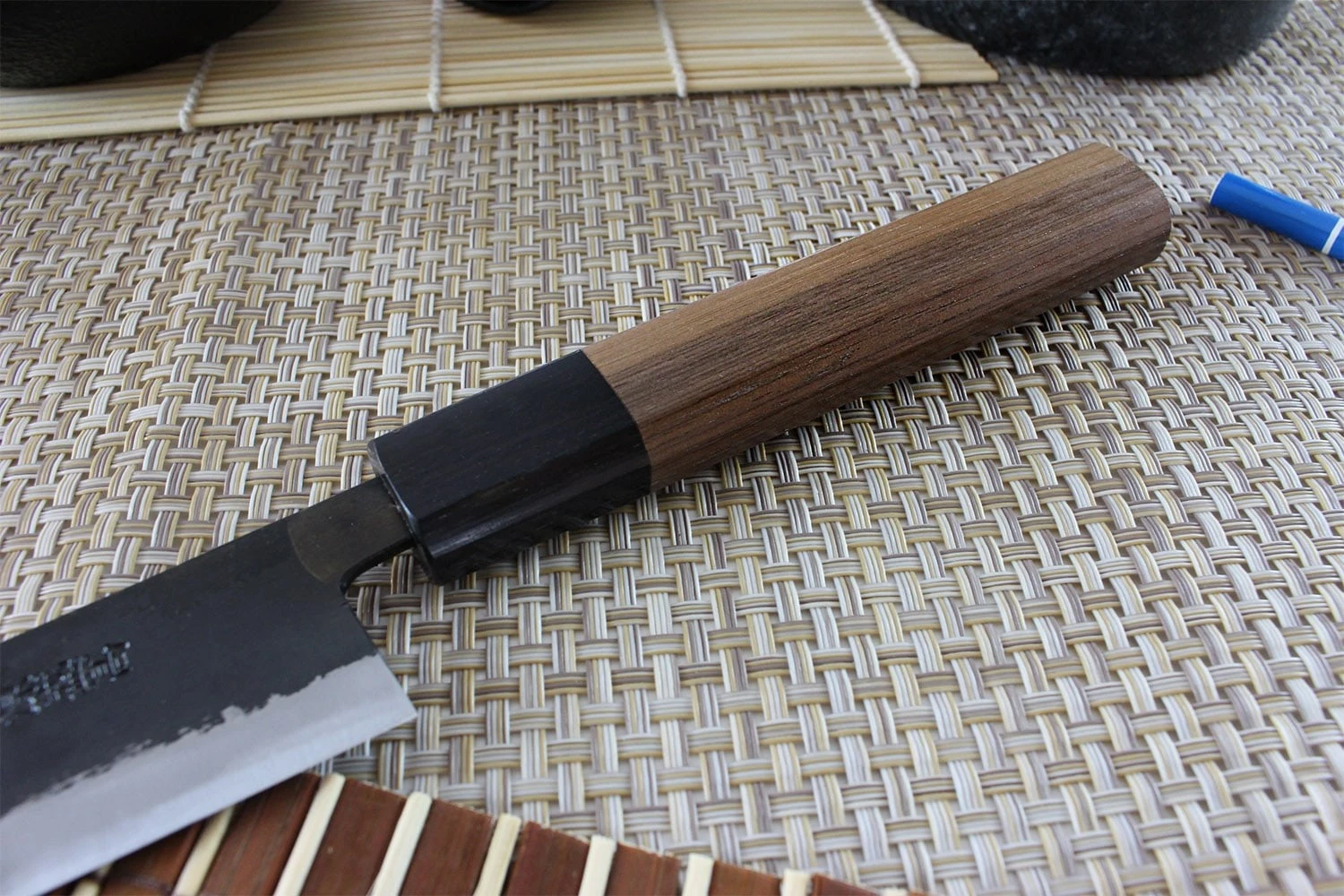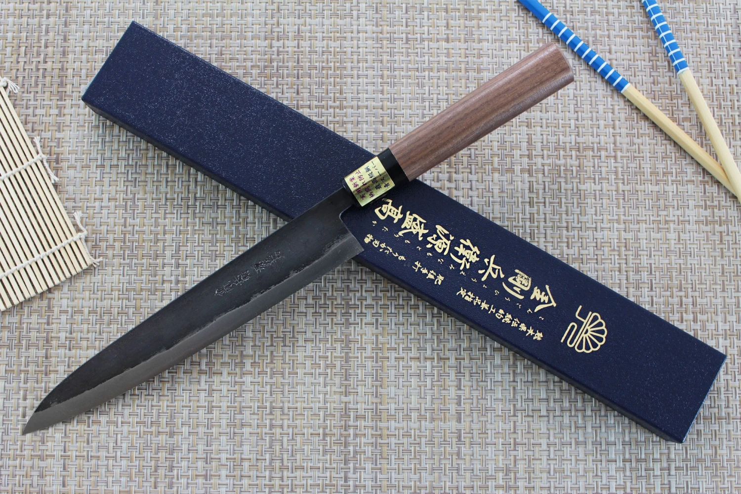 For this yanagiba knife, you can choose between two different types of handles. One is made of walnut wood and has a D-shaped design, whereas the other is made of dark walnut wood and has an octangular shape. Both types of handle are connected to the blade through a black bolster.