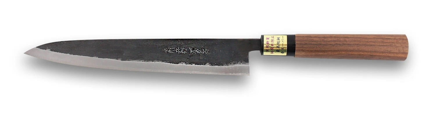 The blade has a V-shaped cutting edge that is more robust than the edges of single-beveled blades. Given that the steel core is symetrically covered by iron, the edge is better protected. Furthermore, such type of edge makes this knife perfectly suitable for both left and right handed cooks, which is something that is less common in Japanese cutlery than in Western cutlery.