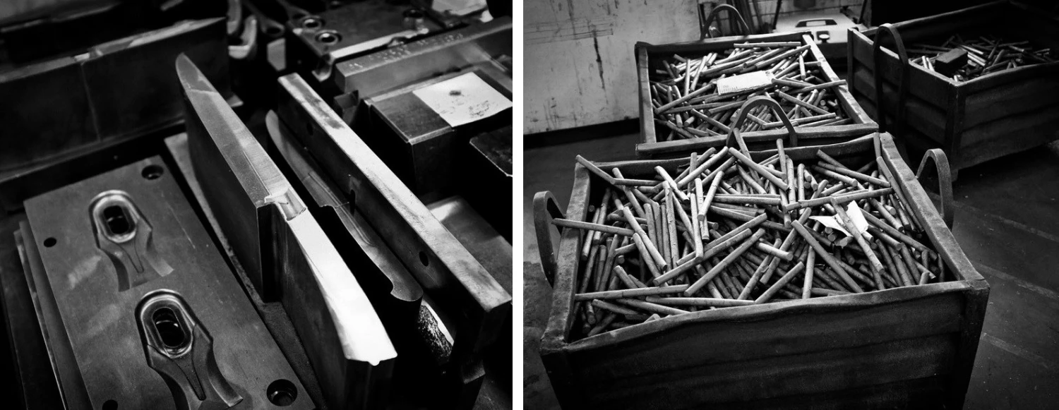 Another important characteristic of the blades of Edonist knives is that they are 100% forged. This means that the blades were forged from one single piece of steel, which was stamped at a temperature of 1100°C to improve their strength and durability. This process of manufacturing forged blades is illustrated in the picture below: