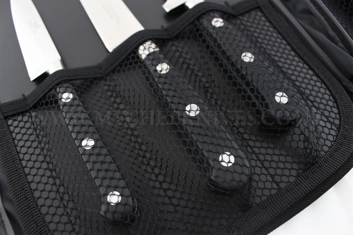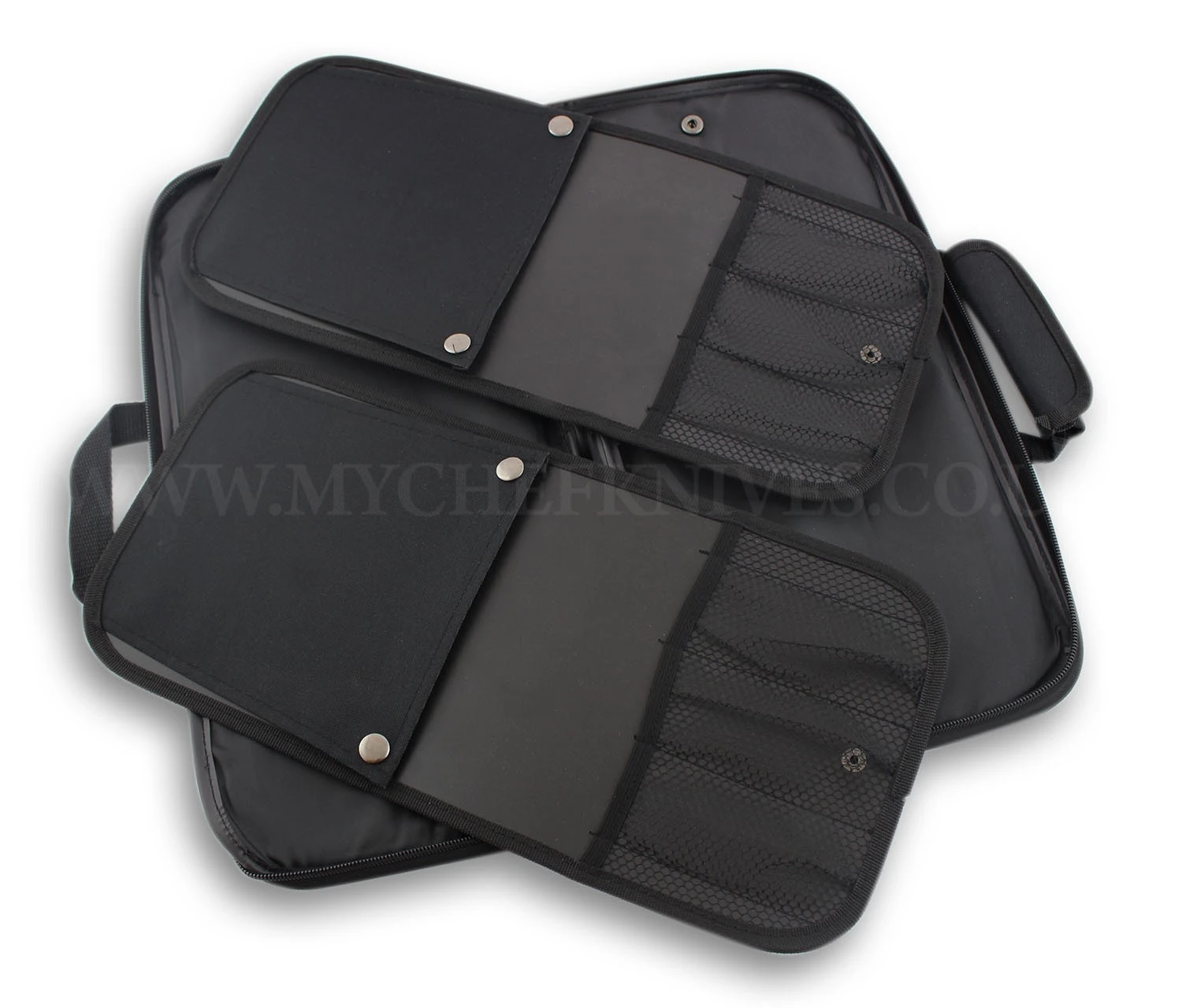 Finally, the set is completed with a black knife bag that enables you to store and carry your kitchen knives and tools in all safety. This bag is made of flexible nylon and it has 2 removable compartments in which you can store up to 6 kitchen utensils (3 on each compartment). The flaps incorporated to each compartment serve to protect the blades of your knives once they are stored inside of the bag.